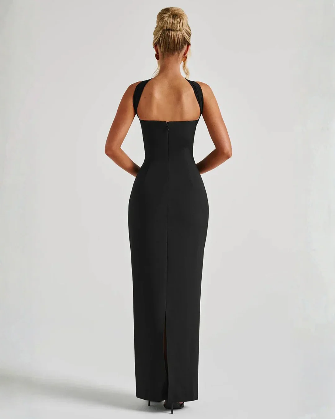 Ella is a sculpting strapless maxi dress made from premium non-stretch crepe. Designed with pleated bodice details, a sleek back slit, and a removable mesh neck panel for versatile styling. Comes with a long mesh scarf to wear your way—draped or tied. Fully lined with an invisible zip closure.