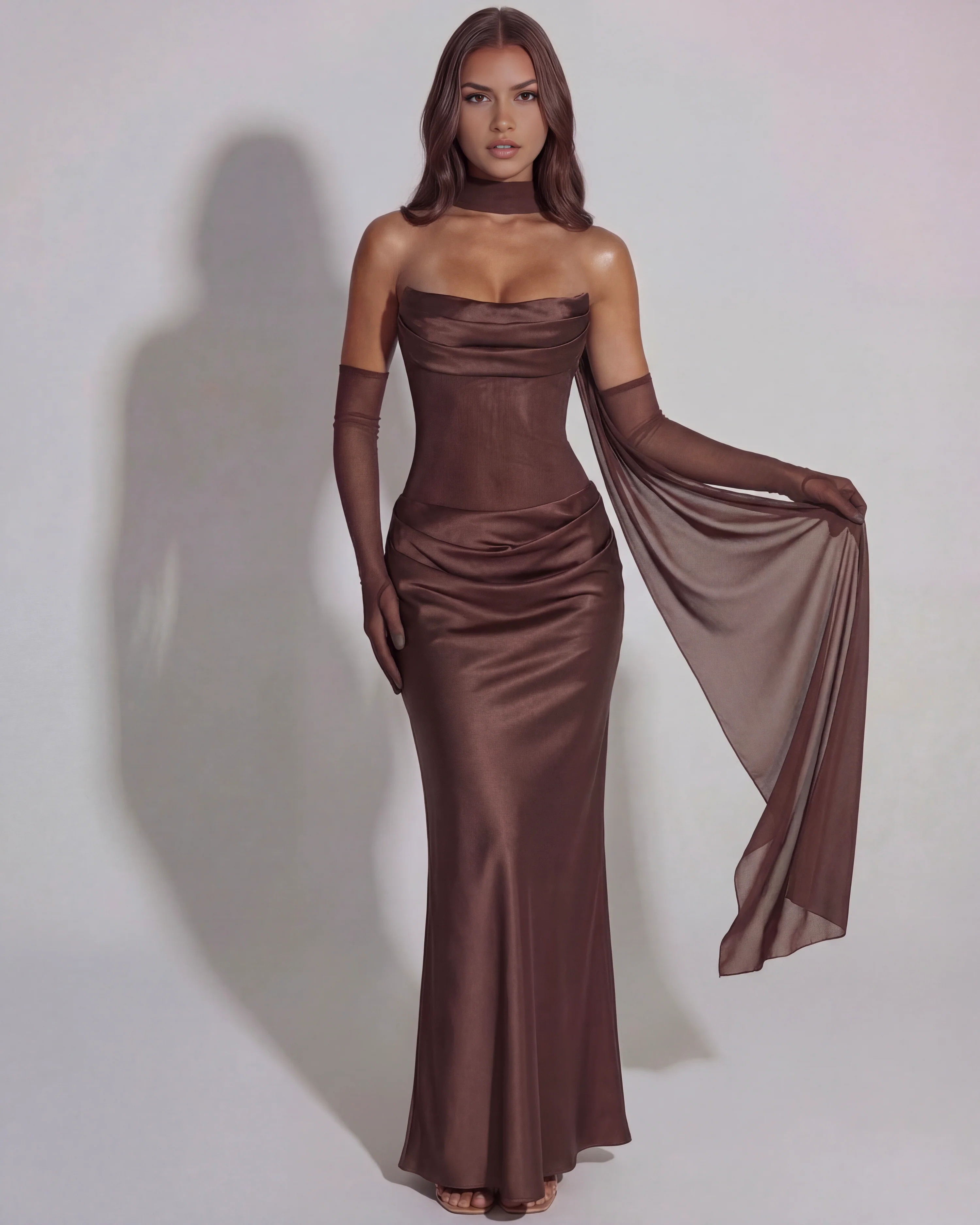 Introducing the ‘Odessa’ Gown – where timeless elegance meets sculpted sensuality. Crafted in a rich brown tone, this mesmerising maxi dress features a cowled, strapless neckline that softly frames the décolletage. The structured bust adds support, while the lace-up back creates a beautifully tailored, cinched silhouette.